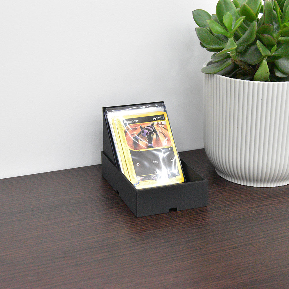 De schuine presentatiehoek zorgt ervoor dat je kaarten overzichtelijk en stijlvol worden weergegeven – perfect voor verzamelaars, verkopers of organisatoren van ruilavonden.