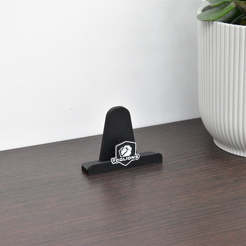 De houder is smal, stabiel en kan worden voorzien van jouw eigen logo of tekst, wat hem perfect maakt voor verzamelaars, winkels of streamers die hun merk willen laten zien.